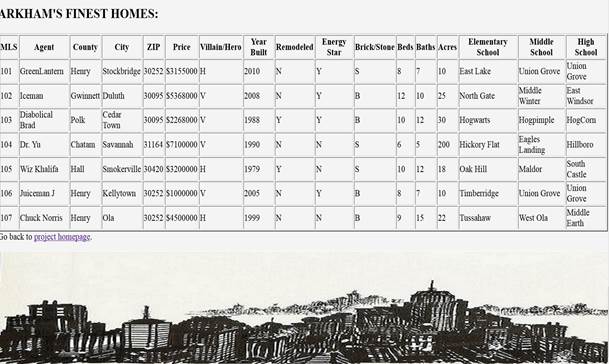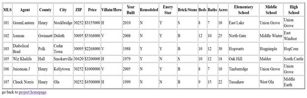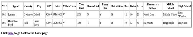 <th>MLS</th> <th>Agent</th> <th>County</th> <th>City</th> <th>ZIP</th> <th>Price</th> <th>Villain/Hero</th>