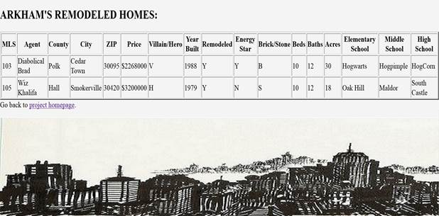 echo "<tr><th>Year Built</th> <th>MLS</th> <th>Agent</th> <th>County</th> <th>City</th> <th>ZIP</th> <th>Price</th> <th>Villain/Hero</th>